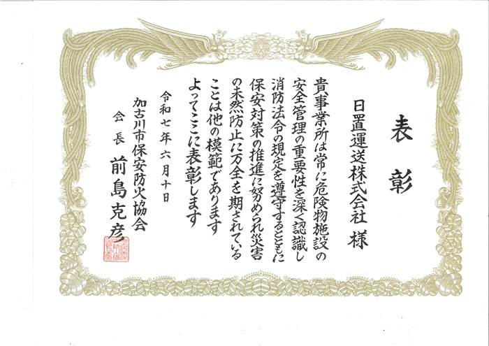 この度、加古川市保安防火協会「協会長表彰 優良危険物事業所」を受賞いたしました。