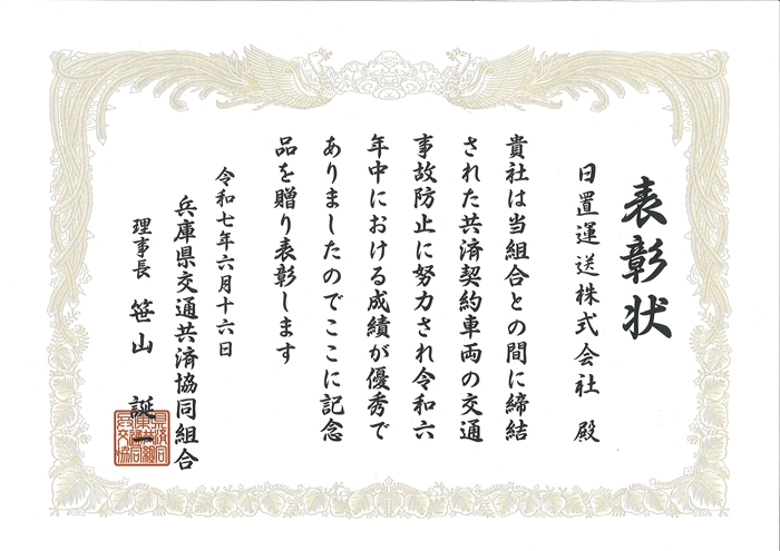 2025/6/16 兵庫県交通共済協同組合様より表彰されました