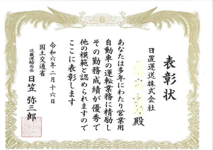 2024/2/16 令和5年近畿運輸局自動車関係功労者表彰を受賞しました
