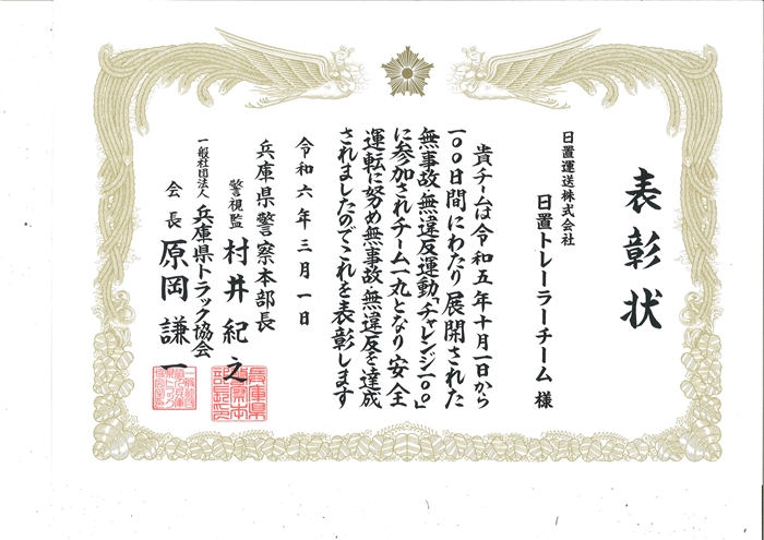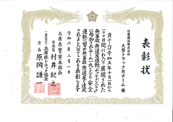 10名を1チームとし、毎年10月1日から年明け1月8日までの100日間、無事故無違反を競い合うもので、達成したチームには兵庫県警察本部と兵庫県トラック協会会長連名で表彰されます。