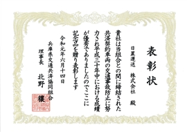 この功績が認められ、多年にわたり営業用自動車の運転に精励しその勤務成績が優秀で他の模範と認められ、関係事業に貢献した功績により表彰されました。