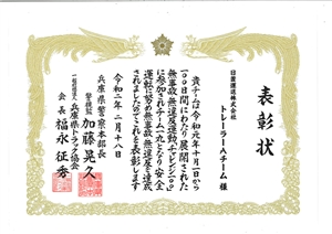 交通事故防止に努力し、平成30年度中における成績が優秀であるのを認められ表彰状を授与されました。