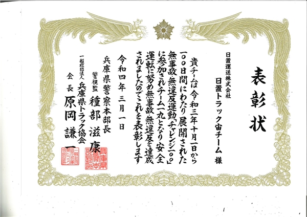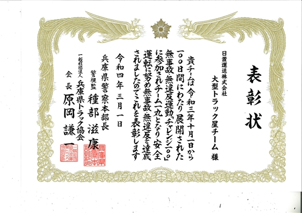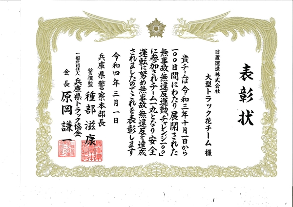 この度、見事に達成したため、兵庫県警察本部長並びに兵庫県トラック協会様より表彰受賞いたしました。