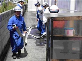全員が避難したことを確認後、初期消火隊を編成し火災現場まで駆けつける訓練を行いました。