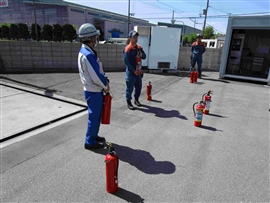 トラックや倉庫・荷物の火災を想定し、初期消火時の動作の確認、消火箇所への同時消火の訓練を行いました。