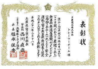 当社従業員は運転者として迅速・丁寧・確実な輸送及び生産性向上に努力し、ほぼ毎日乗務しながら30年間、無違反の運行をし、他の乗務員の管理・指導にも力を注ぎ、平成29年1月に財団法人全国トラック協会様より優秀運転者金十字賞を受賞(20年以上無事故・無違反)、平成30年1月に明石商工会議所様より優良従業員表彰を受賞、また社内における愛車賞やお客様賞も受賞しており、他の乗務員の模範として厚い信頼を得ています。